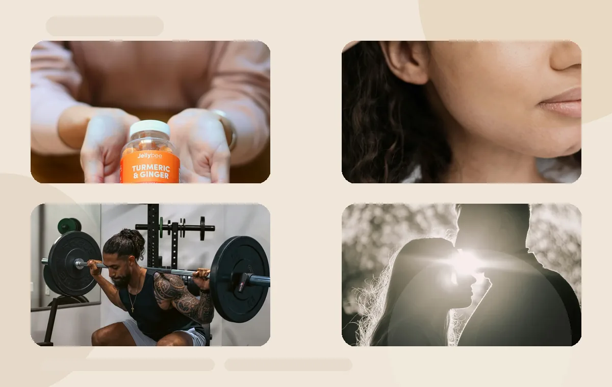 Colagem editorial com referências visuais de saúde, beleza, performance e conexão.
